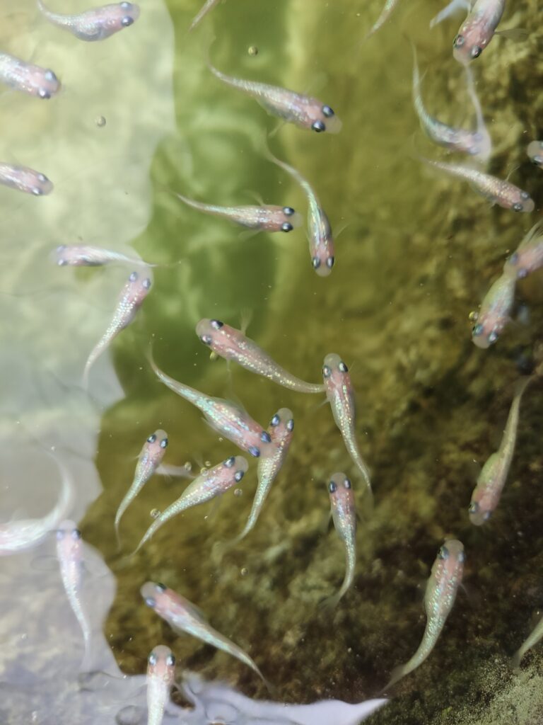 産卵は、産卵床に約10~20個の卵を産みつけます。受精卵は透明で、数日後には孵化します。未授精卵は白色で弾力がなく、すぐ潰れてしまいます。孵化した稚魚は、最初は卵の栄養を使って成長しますが、数日後には餌を求めるようになります。